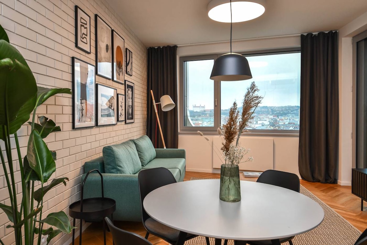 This designer apt on the 13th floor of the Sky Park residence by Zaha Hadid with panoramic view of Bratislava downtown will make you fall in love with the city. You can have your morning coffee on the terrace of the apartment or enjoy the view from the observation deck in 120m hight. Situated next to the Danube promenade, two shopping malls and just 10 min walking from the historical centre makes it perfect start point for the downtown explorer.