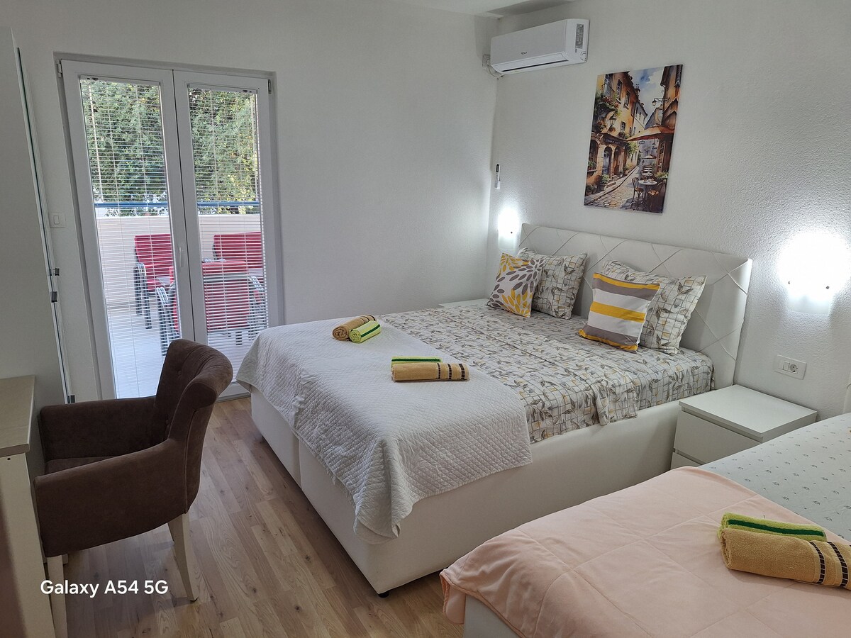 The apartment is located on the first floor, 5 mins away from the Old Town, on foot. The neibhourhood is peaceful, the beaches are 5-10 minutes away on foot. The apartment has 60m2, and the terrace is 40m2 , from which you have a view of the sea of the apartment is a shortcut staircase to the Old Town, beaches and the nearest supermarket. The apartment is detailedly shown in the photos. It has one double and two single beds. Under the apartment is the garden.