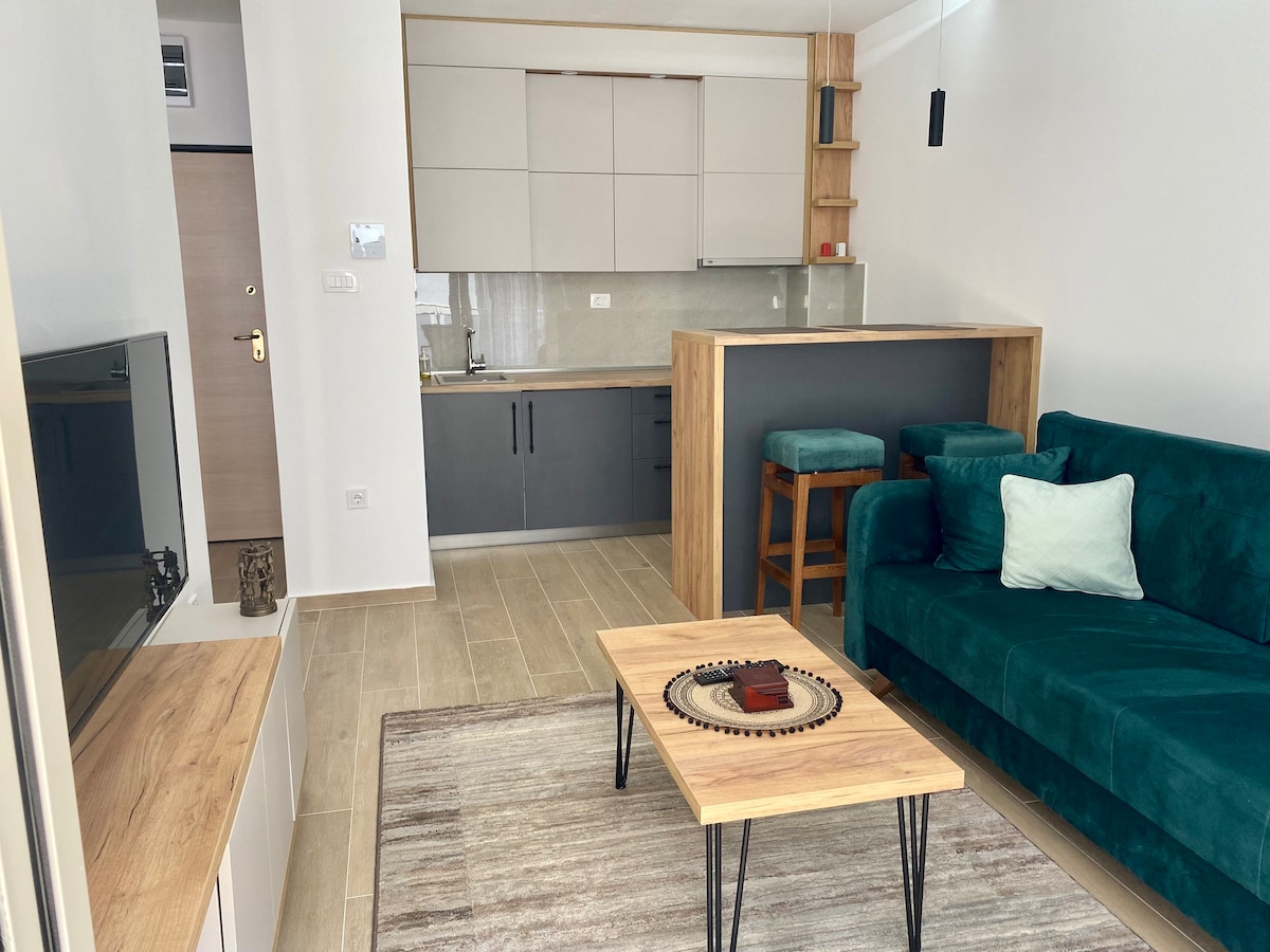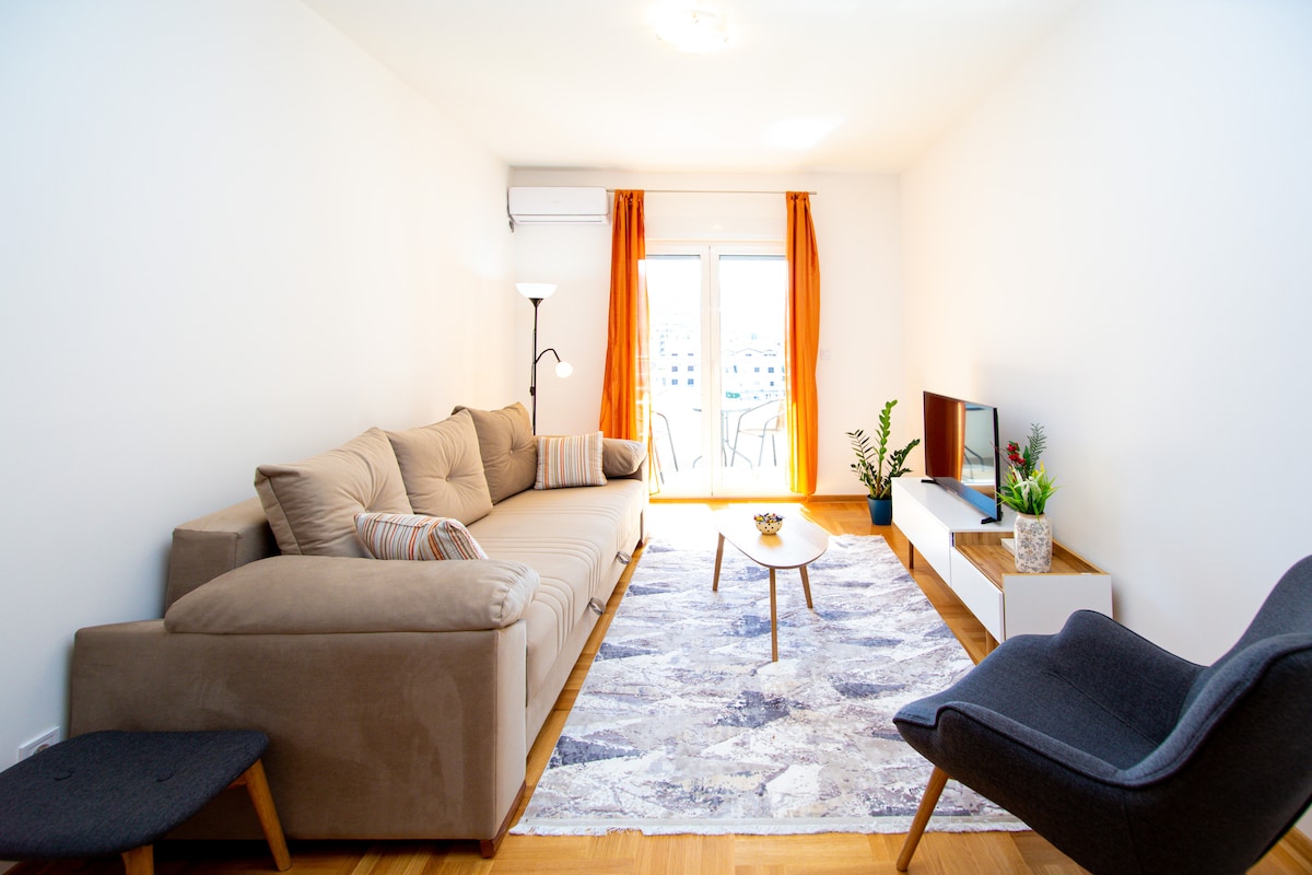 Fully furnished with modern interiors brand new apartment in the hearth of Budva! Within walking distance of day & nightlife options. Exclusive restaurants, cafes, supermarkets, night clubs, 4-minutes walking distance from waterfront promenade/beach. In the middle of all actions but just far enough where it won't affect your SLEEP. Enjoy beautiful views of the sea and the city of Budva from the private balcony. THIS IS THE PLACE TO STAY.