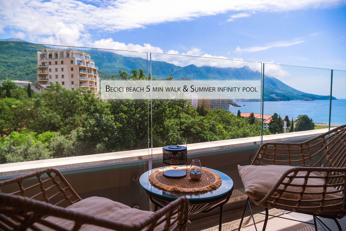 The perfect finish, decor and sea view makes our space the ideal setting for a luxury vacation with a right-next-to-the-beach feel. Treat yourself to a holiday in high style at our infinity pool (summer season) with lounge chairs, breathtaking sea view, while enjoying direct access to the famous Becici beach just a 4 minute walk away. ✔ balcony w/ sea view ✔ sun deck with umbrellas and loungers ✔ infinity pool ✔ 4 min walk to beach ✔ elevator ✔ covered parking (paid)