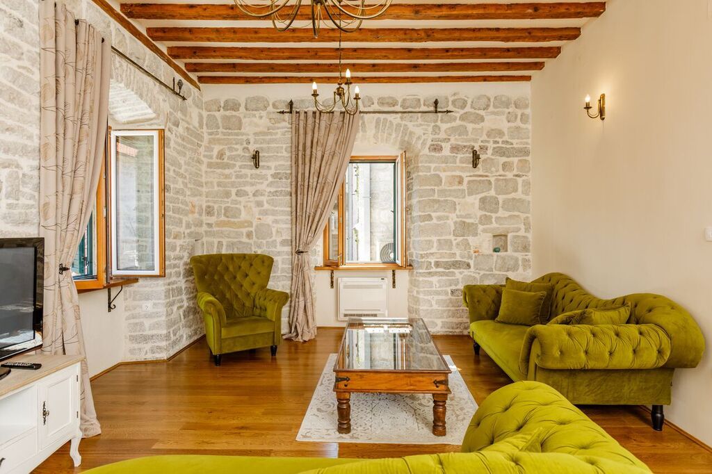 Historic three bedroom apartment situated within the walls of the old town Kotor. The apartament is situated on the second floor of historic building, once known as famous Lombardic palace from 17th century surronded by most beautiful squares in the city,and just few meters away from the main city gate, restaurants, bars and souvenir shops. 3 bedroom, 2 bathroom, huge living room with fire place and balcony, dining room with kitchen, with authentic spirit of Kotor old town.