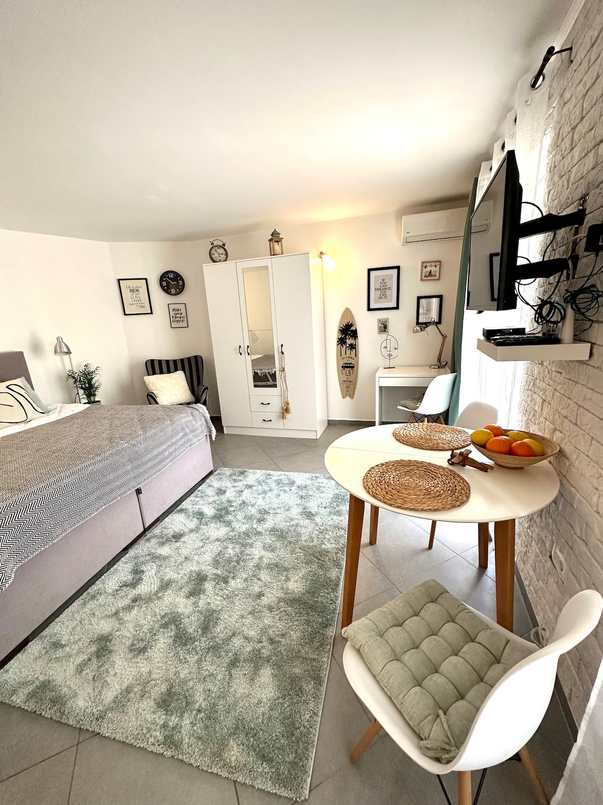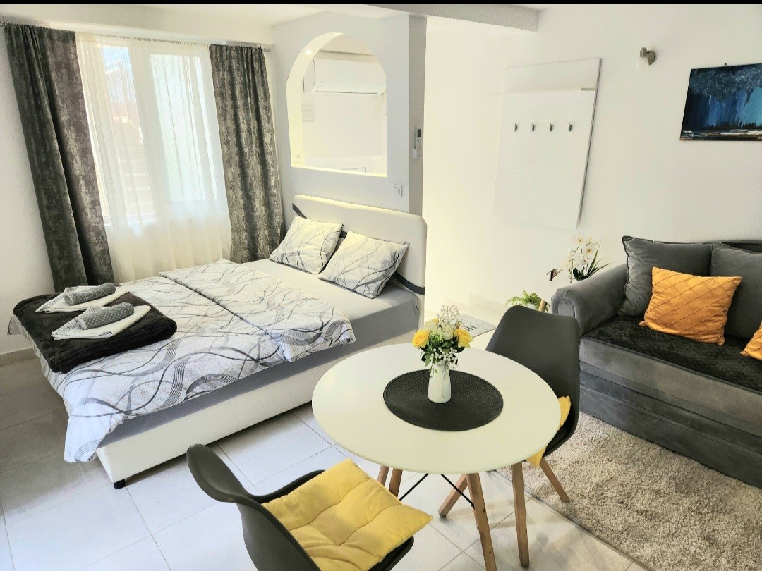 The Cozy Studio with super speed WiFi is equipped with a double bed, bathroom, kitchenette and dinning area. The size of apartment is 23m2 with the 10m2 of terrace and it is situated on the ground floor, 20m from the beach. The beach is equipped with sun loungers they are free of charge for our guests. The parking place is free of charge .If you need good private parking near to as apartment it cost 5 eur per day