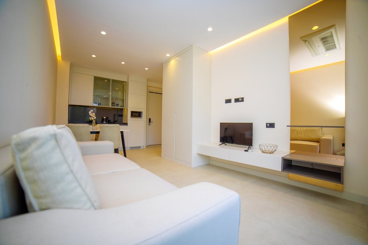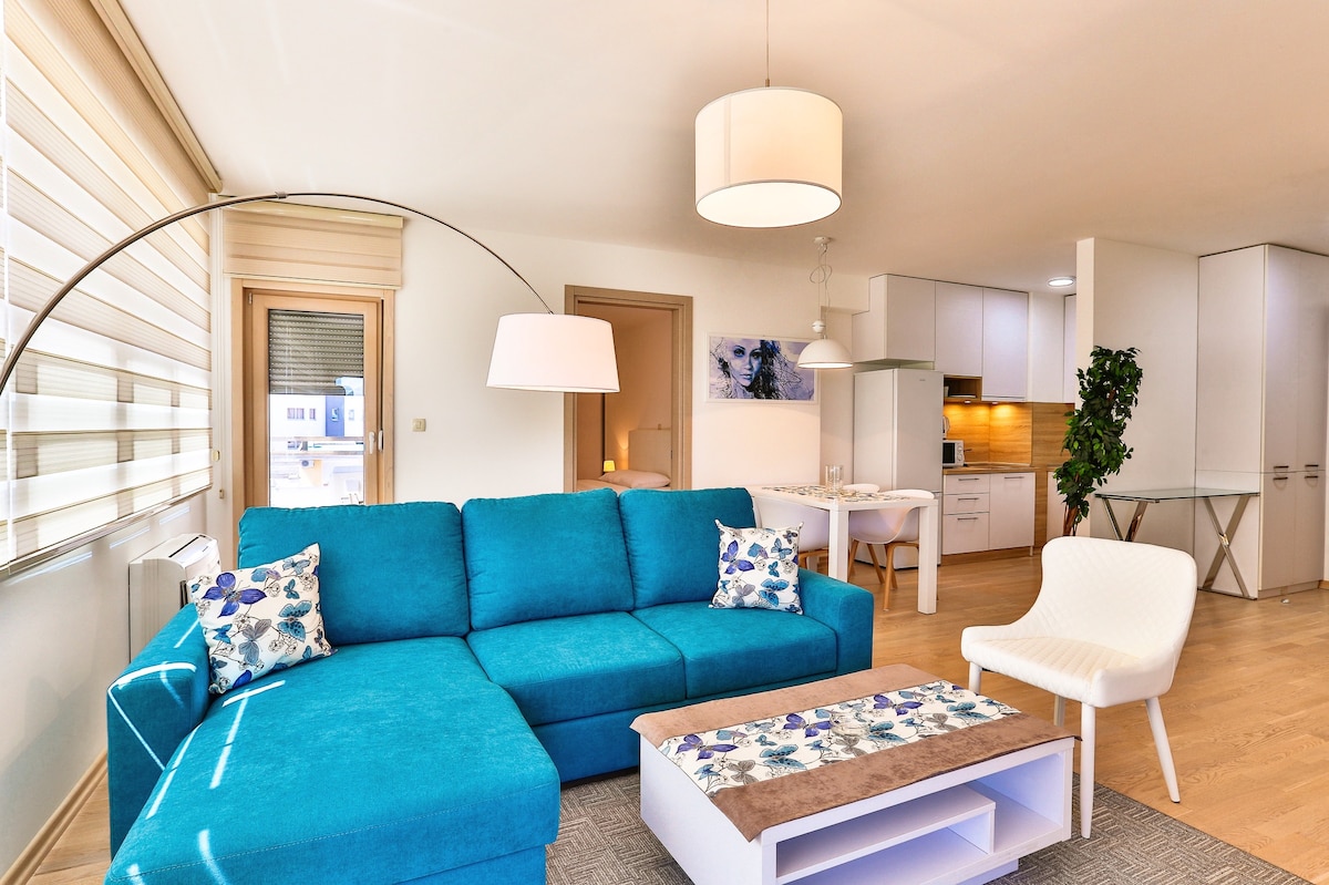Luxury Condo Studio Plaza is located in the city center, within the shopping center TQ Plaza. Studio apartment is 35 m2 in size and is designed for two people. Condo Studio Plaza is only one min away from the beach and 3 min away by walk from the Old Town. The apartment consists of an entrance hall, kitchen, bedroom with work desk, king size bed and a large terrace overlooking the city.