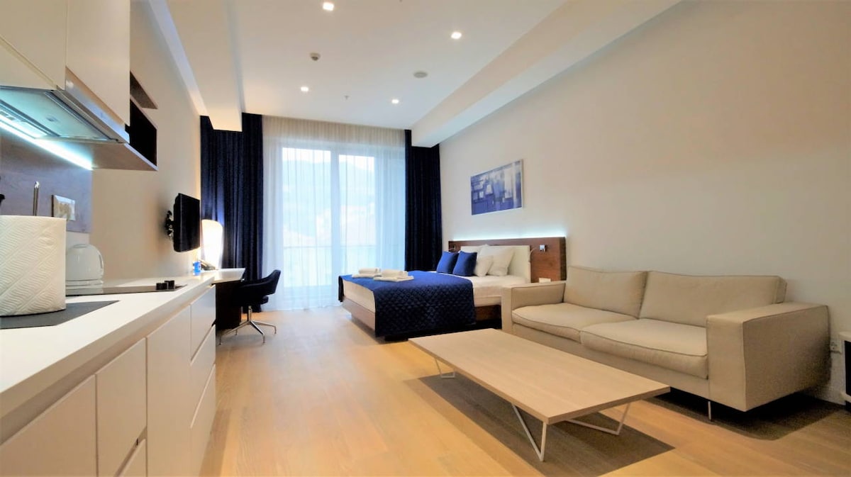 Luxury Condo Studio Plaza is located in the city center, within the shopping center TQ Plaza. Studio apartment is 55 m2 in size and is designed for two people. Condo Studio Plaza is only one min away from the beach and 3 min away by walk from the Old Town. The apartment consists of an entrance hall, kitchen, bedroom with work desk, king size bed and a large terrace overlooking the city.
