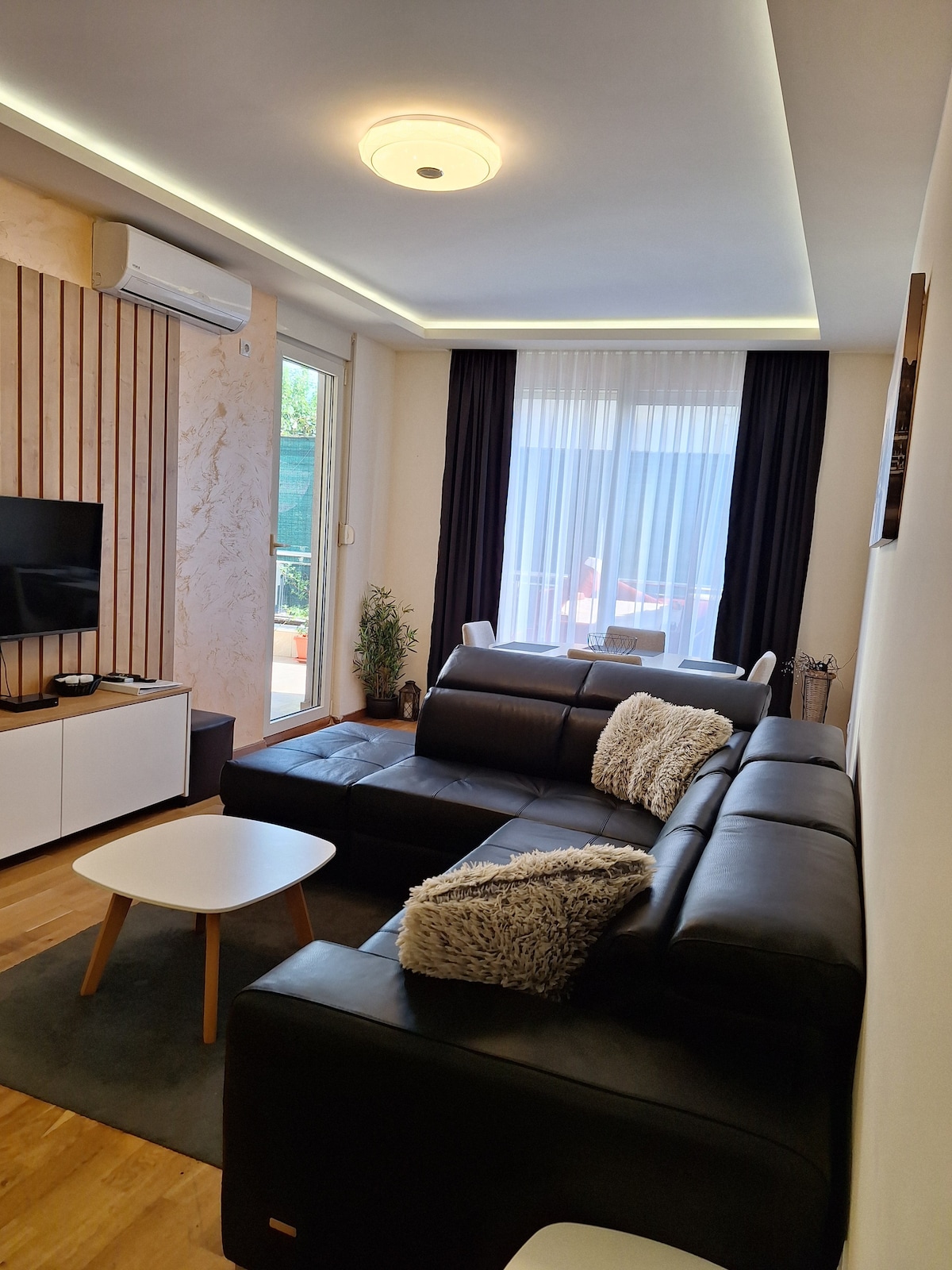 The apartment is located on the ground floor of a modern new building. It is located 200 m from TQ Plaza and Post office and 250 m from the Old town of Budva. Slovenska plaza is a few minutes' walk away, and the famous Mogren natural beach is a 10-minute walk away. It comes with a secured parking space in the underground garage. The apartment has 48 m2 - bedroom, living room with dining room, kitchen, bathroom and a beautiful terrace of 40 m2.