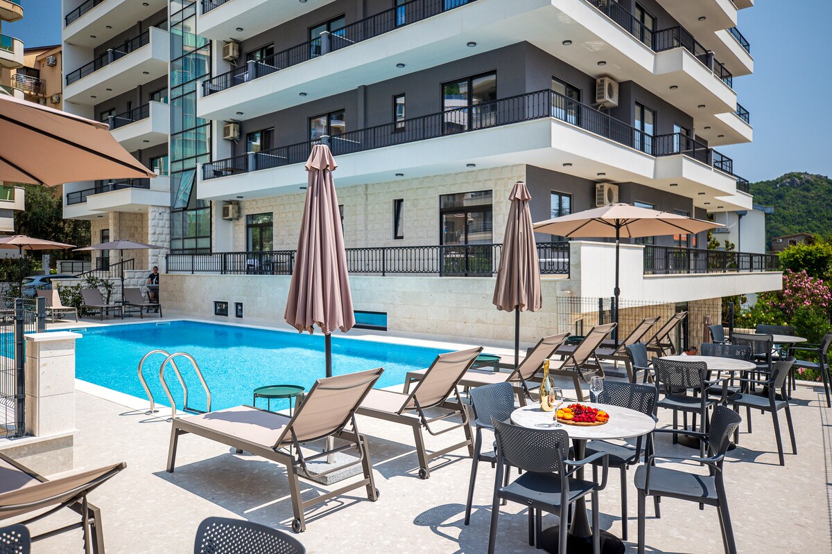 Adriatic Residence is a luxury apartment in Budva,located in heart of the nice area of Becici. It is only 450 meters from the beautiful Becici beach and promenade. Apart from accommodation,we also offer our guests: Restaurant (Breakfast included in price from 01.06.2026 until 01.10.2026) Swimming pool (paid) Garage (Private parking) (paid) Reception Within 250 meters there are markets, shops, bakeries, a children's playground, a sports playground, an outdoor gym and a bus stop. Welcome :)