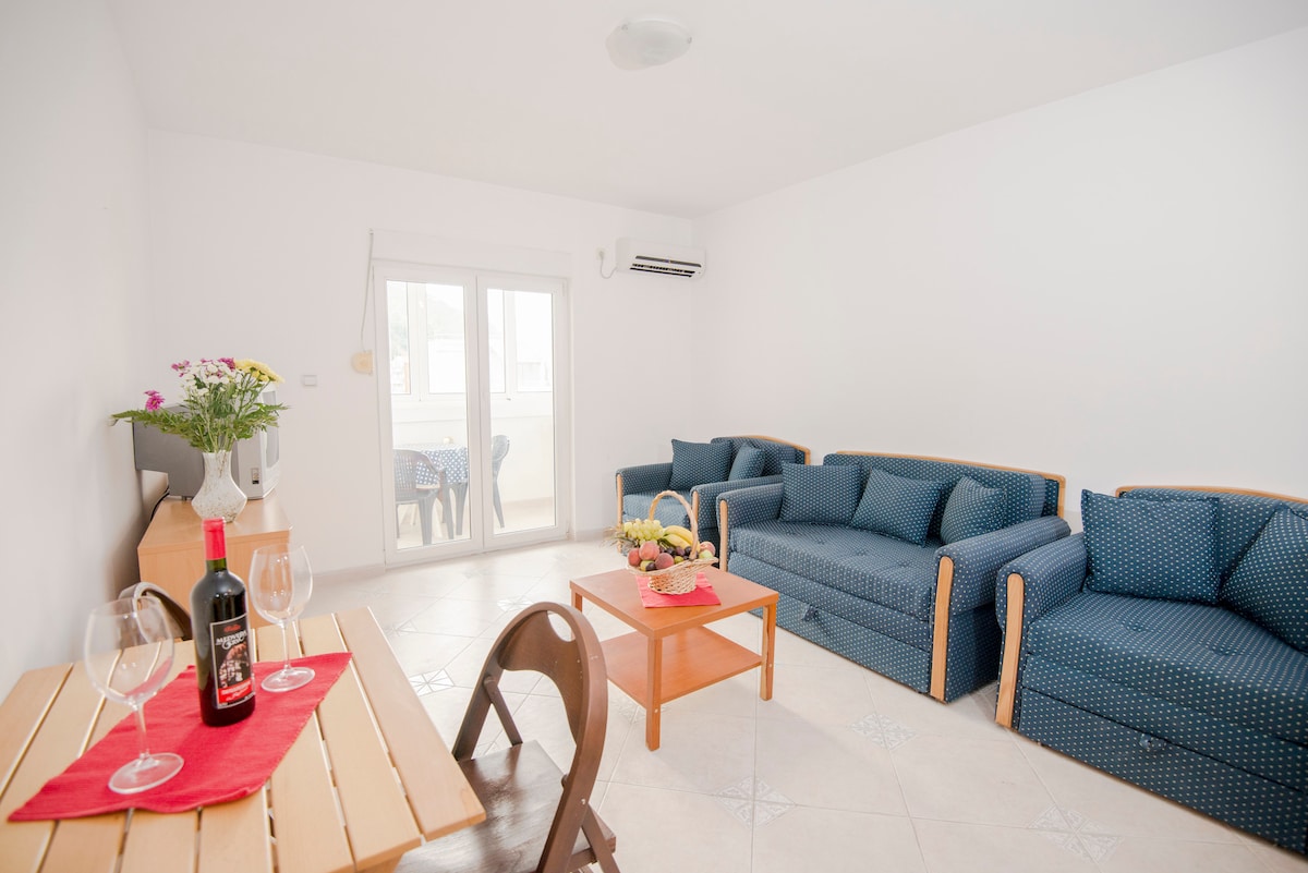 This studio apartment has one double bed and one sofa,fully equipped kitchen and also there is a wardrobe with hangers. We provide linen on every bed. Refresh yourself in cozy bathroom , and all the necessaries we provide. The sofa can be used for pulled out bed for one adult person or two children. On the furnished terrace, you can enjoy your morning coffee. We provide free Wi-Fi in all apartments and cable TV on the flat screen. We provide free parking space in front of the building.