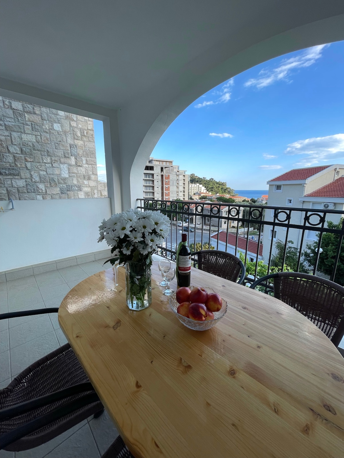 The four-bed apartment has its own bathroom, kitchen, lodge, large terrace in the shade of the vine with a great view of Sv. Stefan. Apartment has wi-fi, private parking. The apartment is good for families who looking for large private space. The market is on 50 m, beach 150 m.