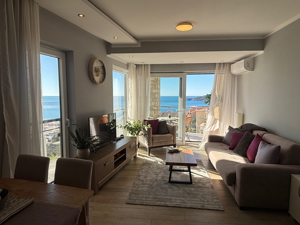 Herzlich willkommen liebe Reisende! Und willkommen in dieser gemütlichen und zugleich luxuriösen Wohnung im beliebten Urlaubsort Budva, direkt an der Adria. Ihr übernachtet in diesem neu erbauten Komplex, welches Luxus und mediterranes, einheimisches Flair verspricht. Setzt euch auf die Terasse und genießt den wundervollen Blick auf das Meer, wo ihr eines der beliebtesten Wahrzeichen Montenegros seht - die Insel Svt.Stephan. Ihr werdet es lieben...