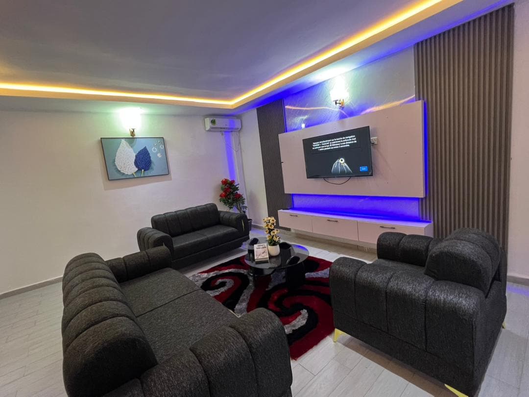Welcome to the most affordable luxury Guest house in Buea. We are delighted to have you as our guest Our fully furnished apartments are located in MOLYKO on tarred MALINGO street beside LANDMARK UNIVERSITY ●2-BEDROOM APARTMENT: Spacious living room, 2Rooms, 2 toilets and kitchen ●AC ● ●55 inches Smart tvs and Bluetooth Home-theater systems ●24/7 Security surveillance ●Parking ●24/7 Water supply *Electricity (Backup Generator incase of outage)