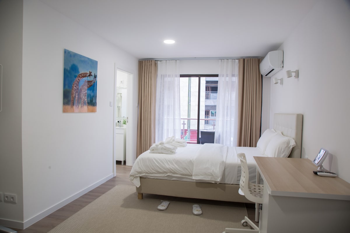 A beautifully decorated suite, with a zen vibe, a cozy double bed, a comfortable sofa, and a fully equipped kitchen and bathroom. Size: 578 sq ft, (Max 3 persons)