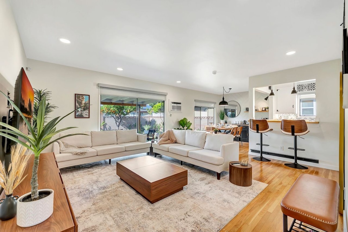 Art-filled retreat with unique artifacts, a lush garden with vibrant plants and vegetation, small pond, private pool & spa, firepit, and outdoor kitchen. Relax in a quiet cul-de-sac with two shaded patios, modern entertainment including streaming TVs, surround sound, a small pool table, and an Xbox. Ideal for families, friends, couples, or business travelers seeking comfort, privacy, and a memorable Southern California stay near Disneyland and major attractions.