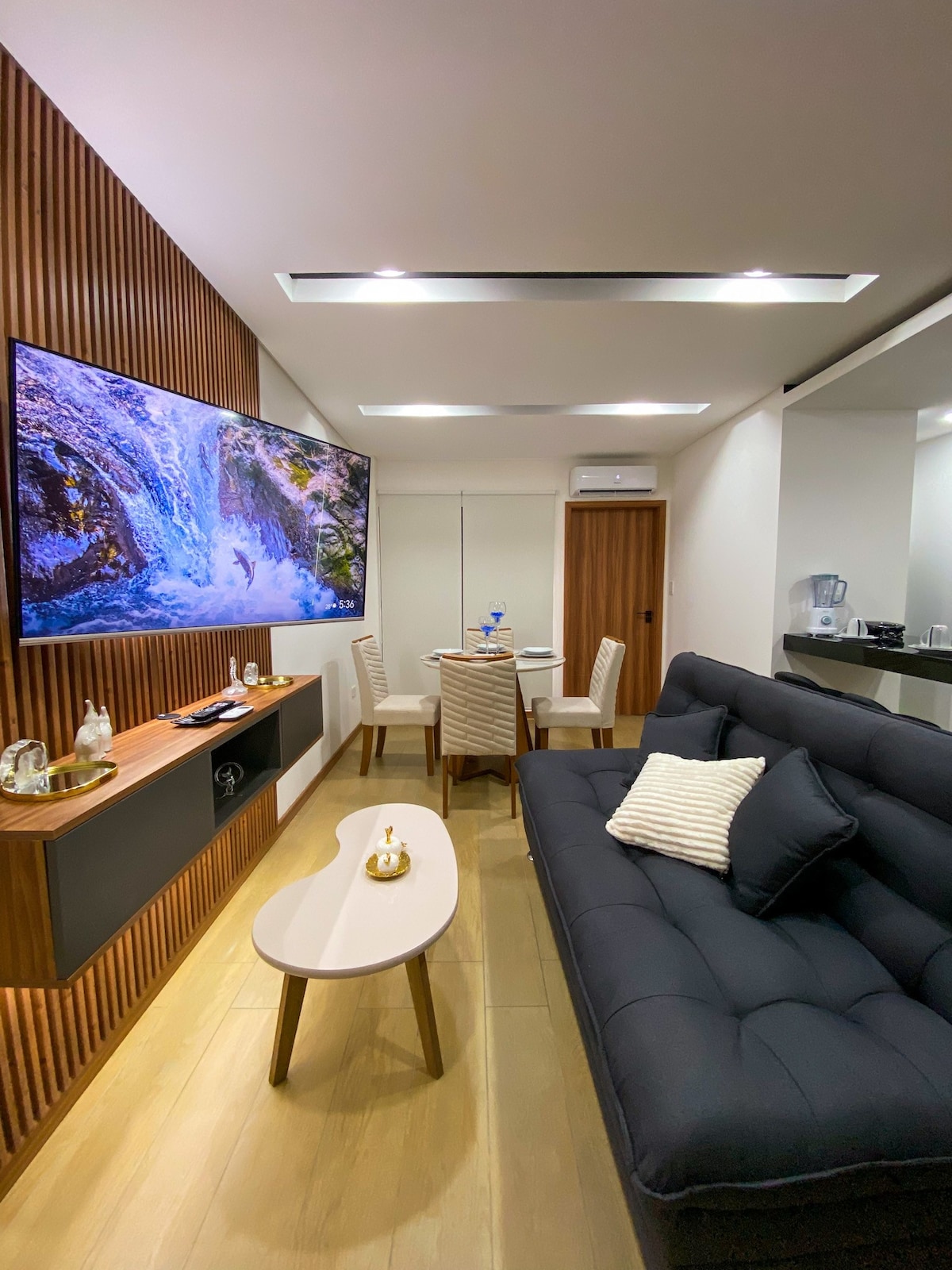 Welcome to your stylish and comfortable studio located in Santa Cruz’s most exclusive area: Equipetrol Norte — just steps from Ventura Mall, Green Tower, and Manzana 40. This studio is perfect for solo travelers, couples, business guests or even small families (up to 3 adults or 2 adults + 2 kids). Inside you’ll find: A double bed and sofa-bed, divided by a sleek glass-block partition for privacy A fully equipped kitchen with oven, cooktop, microwave, and cookware