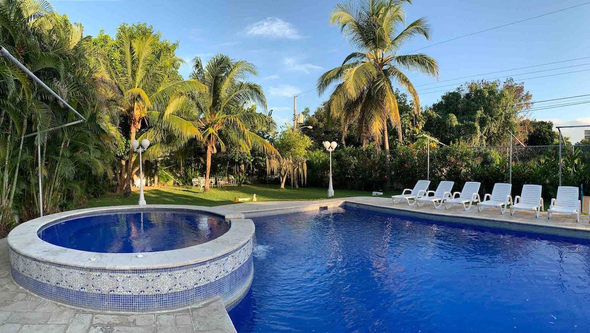 Unique 3-story beach house – one of a kind. 7 bedrooms, 13 beds, 8.5 baths. hot water. Every room with full bath -AC’s and ceiling fans in all rooms, separate laundry -Rooftop area pool, Jacuzzi, bar, BBQ(charcoal & gas) with amazing ocean view -High ceilings, large open kitchen and living area. -Spacious balcony for dining or relaxing. - 5 min. walk to the beach. -Parking for up to 7 cars - Base rate covers up to 4 guests, with a $40 charge per additional person, per night.