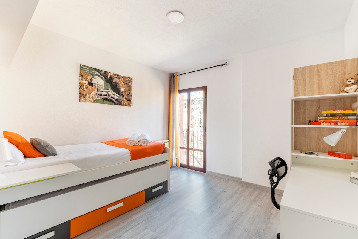 13m2 room with a private bathroom, a wardrobe and a desk: this is our offer of practical and comfortable accommodation for solo trips :) We are in Carabanchel, a south-western area just outside of Madrid, at 50min by public transport from the city centre. It is a private space that shares a corridor with 5 more rooms, but ensuring maximum privacy. We have organized the space to make it as cozy as possible with the basics (there is no kitchen, we leave a coffee machine at your disposal) :)