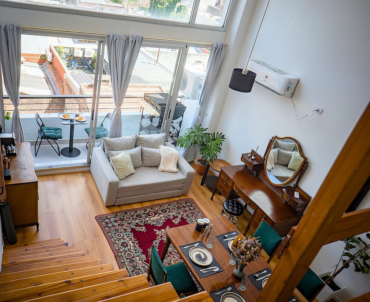 Ascend the floating spiral staircase to the exposed-brick mezzanine bedroom where the king bed can be set up as 2 twin beds when specified. Come morning, the double height ceilings and fine arched windows ensure a long-lasting embrace from the sun, while the New York-style bathroom tiling is equally welcoming. * Please be aware, that my Loft can accommodate up to 4 guests, but 2 would be using floor mattresses. As a welcome gift, I am including a few coffee pods, sugar / sweetener and a bottled water. With its double height windows, our loft is bathed in morning sunlight and very lumunious throughout the day. Based on our love for cooking, despite the kitchen's size which is compact, we made sure it is very complete with a gas oven, microwave, fridge, plates and cutlery for you to enjoy a glass of a good Malbec and a homemade meal after a day discovering this fabulous city. (you are 2 squares away from "Mercado de San Telmo" with plenty of fresh produce) The mezzanine bedroom, reached by a spiral staircase, has 2 twin size beds that can be converted easily into a king size bed , and 2 extra mattresses for 2 more guests. The bathroom has been fully remodeled with New York style tiles, shower/tub, and an separate wash basin. You will have access to the whole Loft Though we live about 1 hour out of town, we are always available and very happy to advise and help you in any way for a really enjoyable stay. San Telmo is the oldest and most traditional quarter of Buenos Aires, retaining its architectural heritage and cobbled streets. Nowadays, the area is also well known for its bars, restaurants, weekend street fair, and many antiques galleries. We highly recommend walking around the neighborhood, so as to enjoy the 19th century constructions and their very precious details. For larger distances, you can choose from buses, subway and taxis. As additional info, you are also in walking distance to Puerto Madero with all its restaurants and nightlife and to Colonia Express for day cruises to Colonia del Uruguay, which by the way, we highly reccomend.