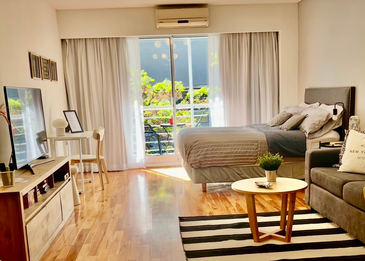 Stylish studio in Palermo's heart. Experience the best of Palermo in our brand stylish studio! Unwind amidst modern furniture and relish the center-of-it-all location. Enjoy the luxury building with pool, sauna, sum, laundry and garden. Explore trendy shops, art galleries and dine at diverse eateries. Ideal for solo adventurers, couples or business travelers seeking a comfortable and memorable stay in Buenos Aires vibrant heart. Book now and indulge in the allure of Palermo!