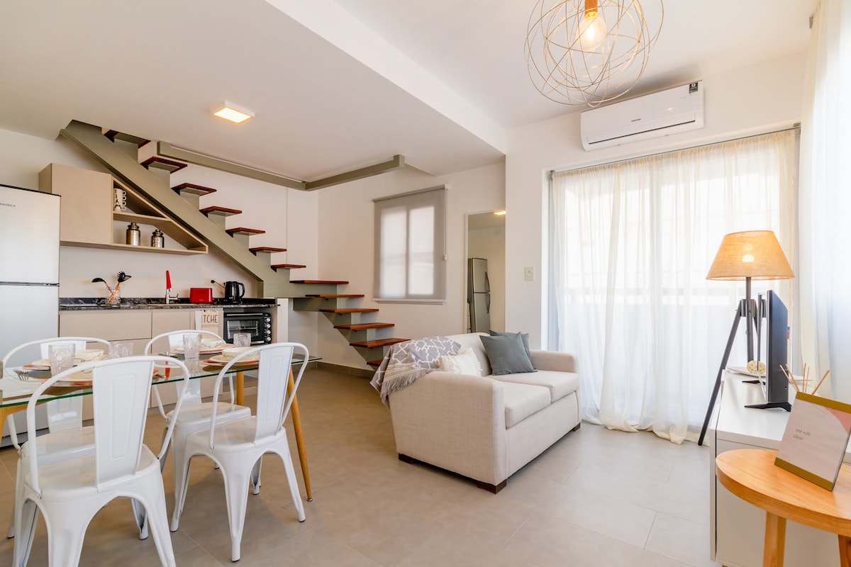Creá recuerdos inolvidables en este alojamiento único e ideal para familias. Es especial para quienes quieren estar cerca de todo, y contar con espacio. Moderno, completo, con balcón al exterior con parrilla. Mucha luz. 1er piso: Cocina + Sala y toillete y amplio balcon con parrilla. 2do piso: Dos habitaciones + baño. Ven y velo por ti mismo!