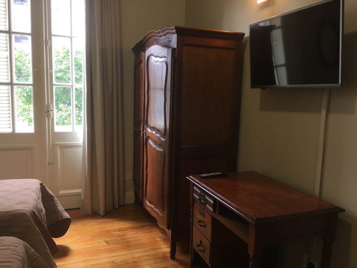 Es una casa de familia en pleno barrio de Palermo Soho. Tenemos una gata y una perra muy amigables. Somos gay friendly. No aceptamos niños menores de 12 años. El cuarto tiene 28 mt2, dispone de cama doble y un cómodo sillón, posee SMART TV con servicio por cable y wifi free. El baño es de uso exclusivo y de grandes dimensiones, tiene 15 mt2, espacio compartimentado de inodoro y bidet, tiene gabinete de ducha y una bañadera antigua.
