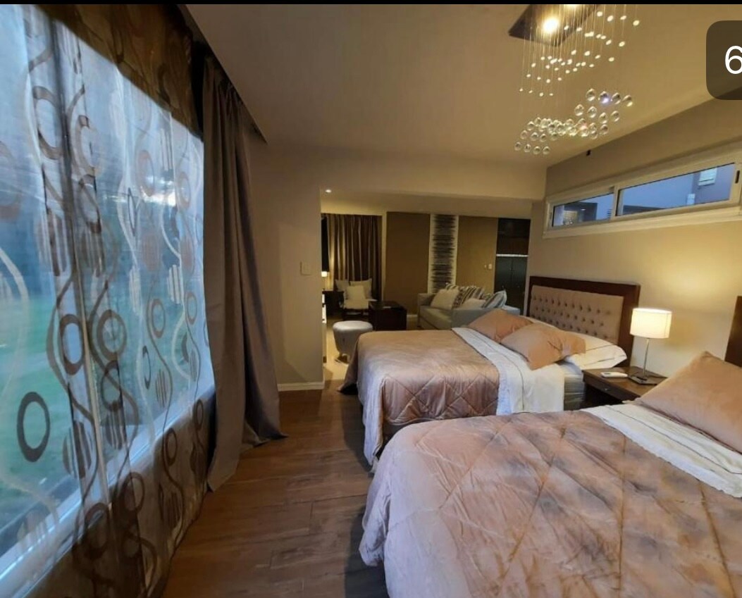 Unidad de 28mts2 con iluminación natural – Carpintería de techo a piso con doble vidrio para aislación térmica y sonora – Cama king/twin size -Climatización de ambiente – Frío/Calor con control individual – LCD TV (Novedad! Ahora también disponemos de unidades con Smart TV 43″) – Conexión a Internet de alta velocidad (fibra óptica 50Mb) – Black Out - Baños equipados con hidromasaje - Caja de seguridad con capacidad para laptop - Frigobar - Teléfono con línea individual - Microondas.