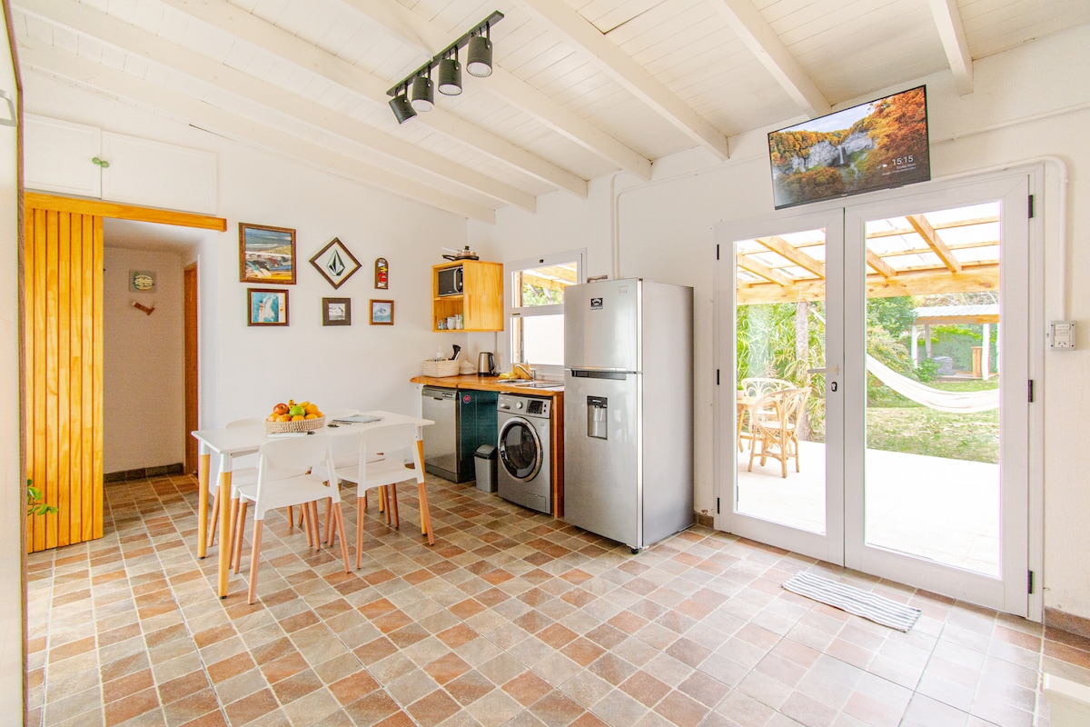 Vivi el campo y el mar a 400 metros de la playa Cruz del Sur. Disfrutá de un entorno natural y relajante. Se trata de una casa modular que construimos para disfrutar en familia y que decidimos alquilar en épocas de año en las que no la usamos. Posee un dormitorio con cama matrimonial que puede transformarse en 2 singles, una cocina totalmente equipada y un living con sillones y salamandra para la cual dejamos leña disponible. En el dormitorio hay una estufa. Cuenta con servicio de wifi.