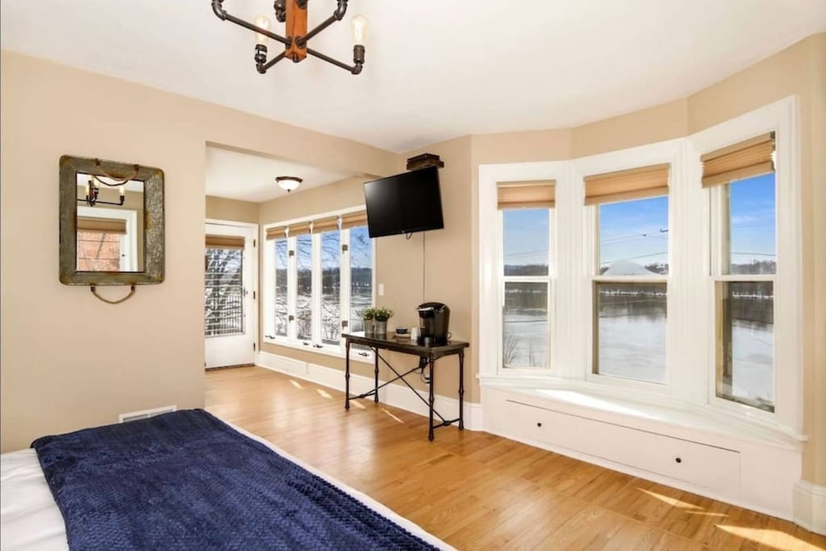Big River Inn is located in beautiful Alma, Wisconsin. This unique 3 bedroom 2nd story apartment sits above the iconic Big River Theatre and offers panoramic views of the Mississippi River. The open floor plan features a spacious family room with an adorable window seat overlooking beautiful Alma. Relax on your private patio viewing the river and city below - a perfect setting for gathering and taking in the picturesque sunset.
