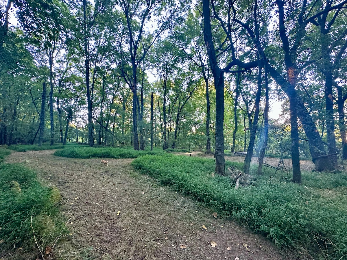 A cozy, shaded woodland campsite perfect for 1 tent and up to 2 guests. Includes a rustic fire ring and direct access to the woodland trail. Peaceful and private, tucked beneath the tall canopy of oaks and maples. Primitive camping—BYO tent/gear; no water, power, or bathroom yet (composting outhouse planned). Park at the top of the drive and walk a short trail to your site. Wildlife and birds are frequent visitors—ideal for a quiet getaway.