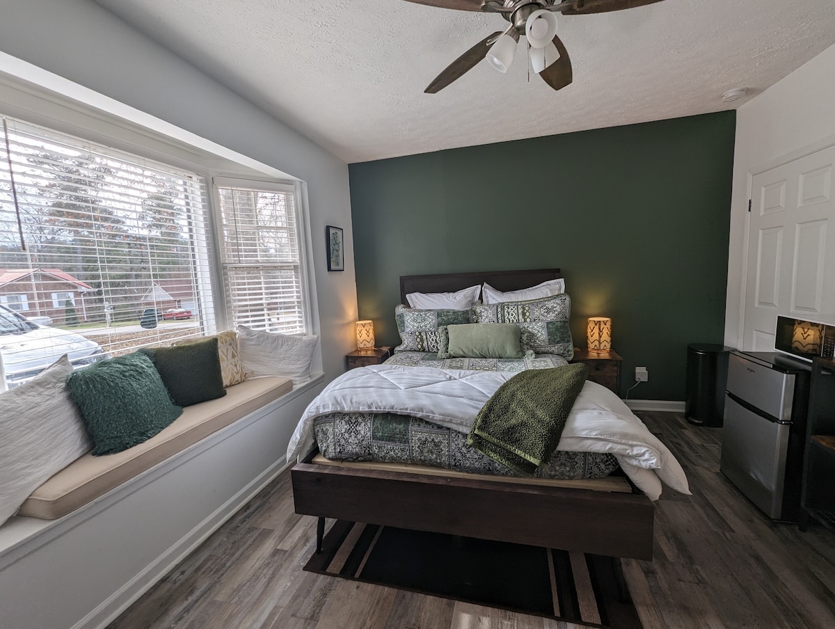 You won’t want to leave this charming, one-of-a-kind place. The Great Green Room offers a completely private entry, living space, and bathroom. It is attached to our personal home but has zero shared space. It is equipped with mini fridge, microwave, kuerig, toaster, and kitchen necessities. We are close to great food and shopping. Only five minutes away from Lake Lanier and centrally located between Gainesville and Flowery Branch, GA. We are close to 985 and 20 minutes from the Mall of Georgia!