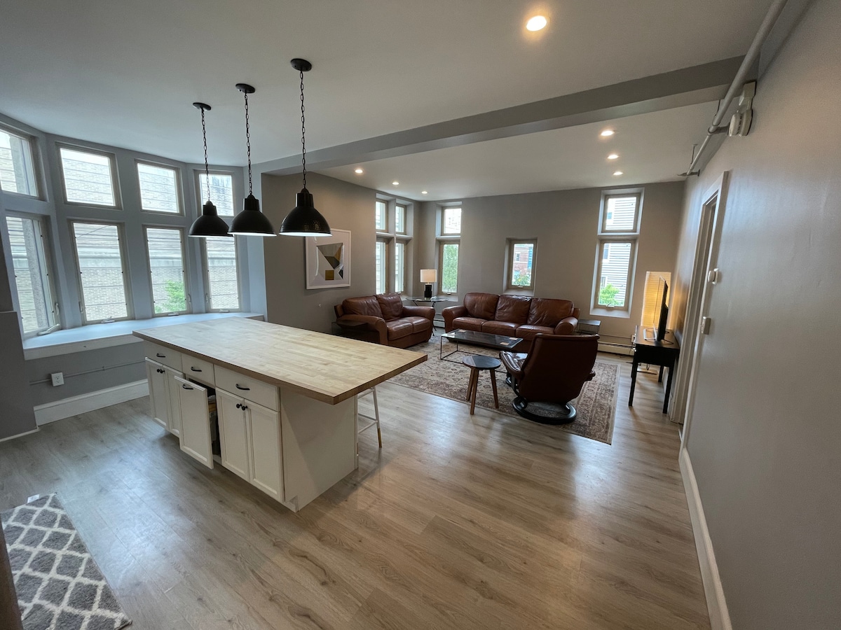 Newly renovated, spacious and modern top-floor condo in a posh historic building in the heart of downtown Portland. Leave your car behind! Walking distance to tons of bars/restaurants, stores, a block from the Portland Harbor/Commercial St and 3 blocks from Merrill Auditorium. Please note there is an additional $50 cleaning charge for stays greater than 7 nights. For stays greater than 14 nights, the cleaning fee is $180.