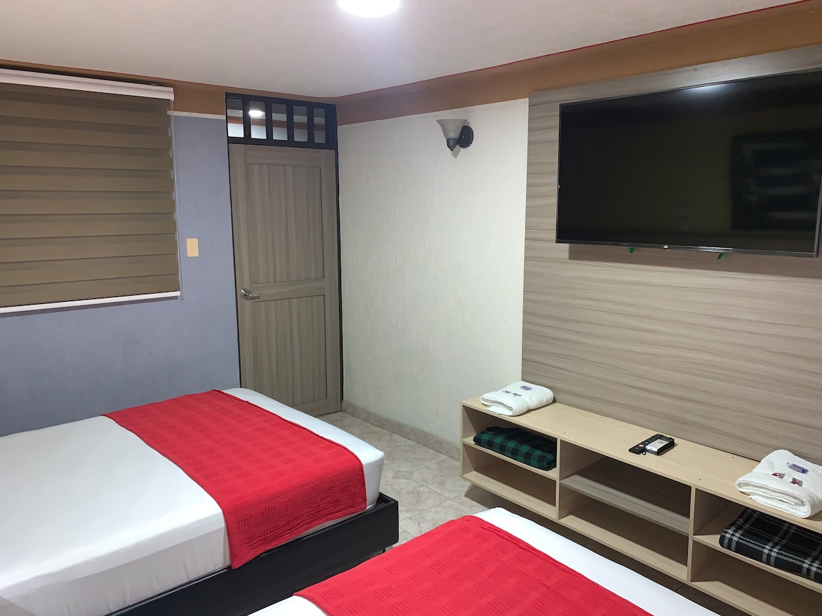 Hotel moderno, habitaciones con aire acondicionado, agua caliente, tv pantalla plana, nevera minibar, shampoo, jabón, toallas y cobijas. Recepción 24 horas. Venta de bebidas. Desayuno tipo americano incluido en la tarifa. Zona de comedor cubierta y al aire libre. Piscina. A una cuadra de la Basílica del Señor de los Milagros de Buga. A 5 minutos del terminal de transportes.