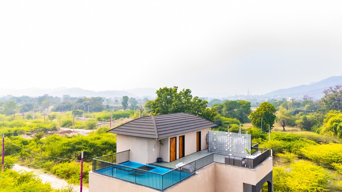 The Glass House is a 2 Bedroom Pool Villa with stunning view of Aravalis - farmlands and orchards. We can accommodate around 6 person in this two bed room villa We don't offer Luxury but Warmth & Comfort; offering simple food and an experience. People who loved staying here were Nature Lovers, Artists, Writers, Group of Friends who want to reunite and spend some time, Families who want to expose their kids to nature and Farm life and Human Beings who want to spend time in the hills.