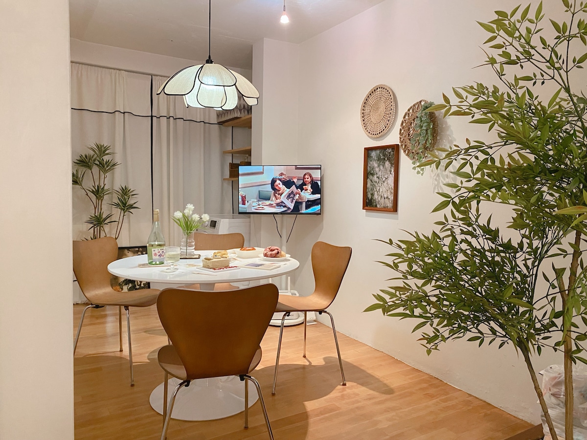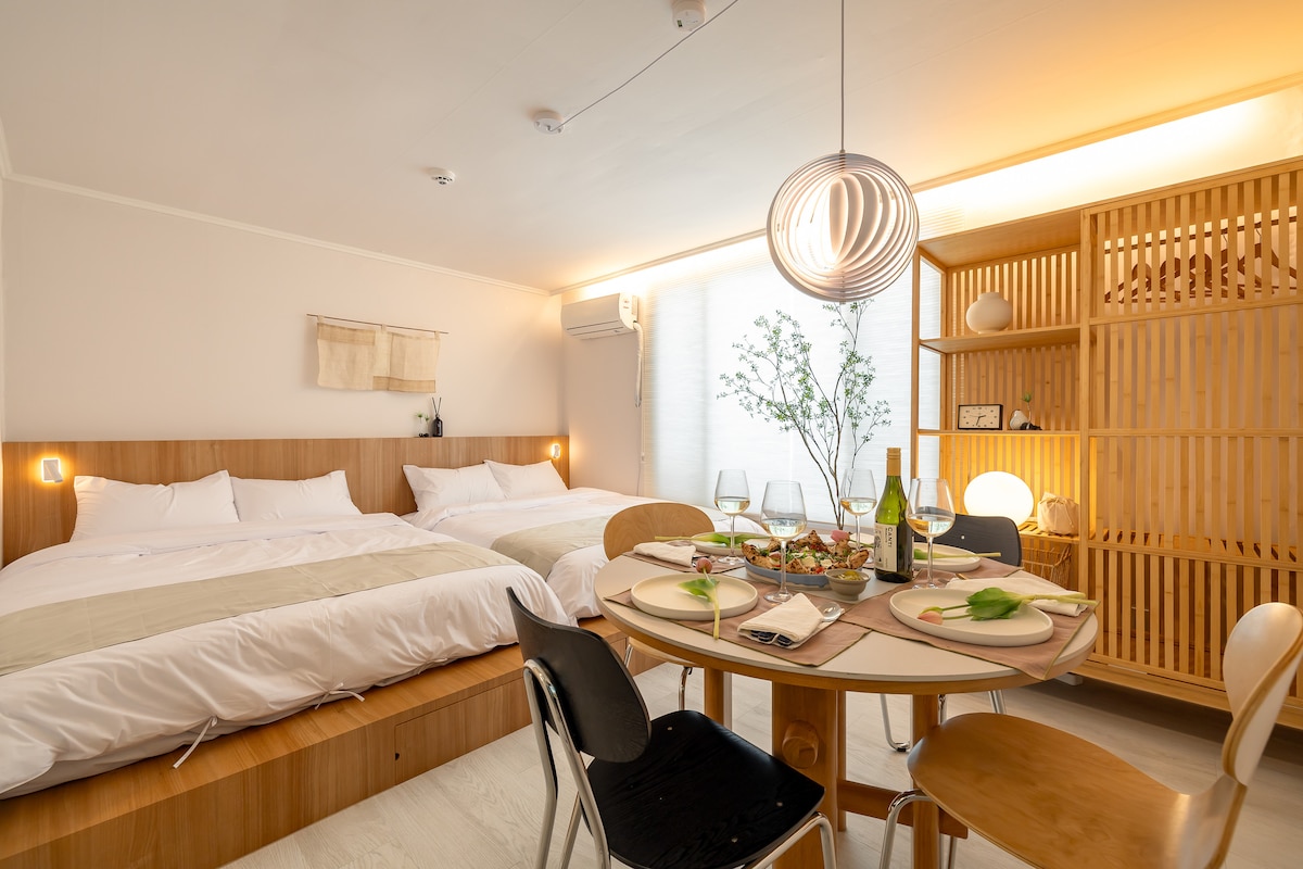 A bright one-bedroom suite with large windows and a spacious desk โ ideal for working travelers or those who love natural light. This calming space includes a unique bathroom design, a compact kitchen with all essentials, and a cozy sofa bed to accommodate a third guest. Nestled in a 1965 heritage building with warm wood accents and Korean handmade details, the flat offers a tranquil yet connected stay in the heart of Seoul, just steps from Seosulla-gil and Changdeokgung Palace.