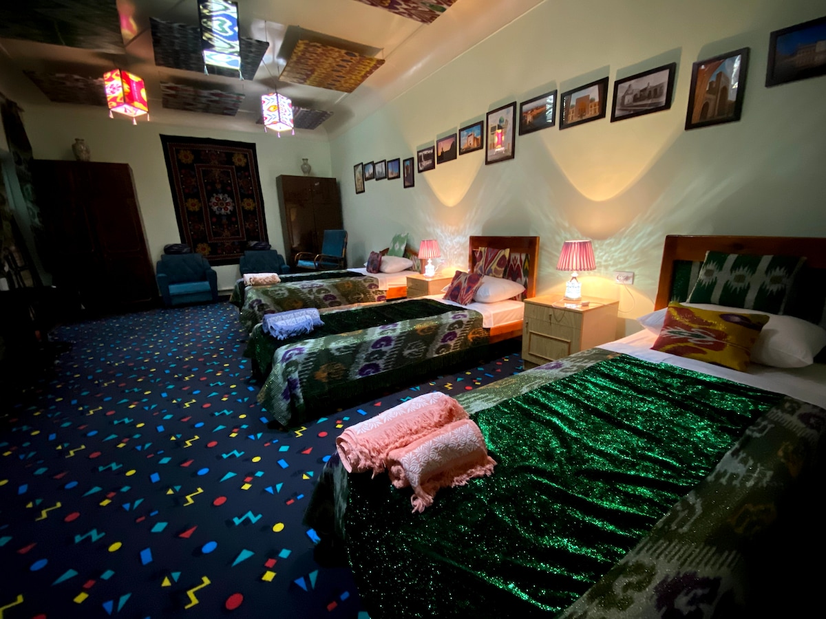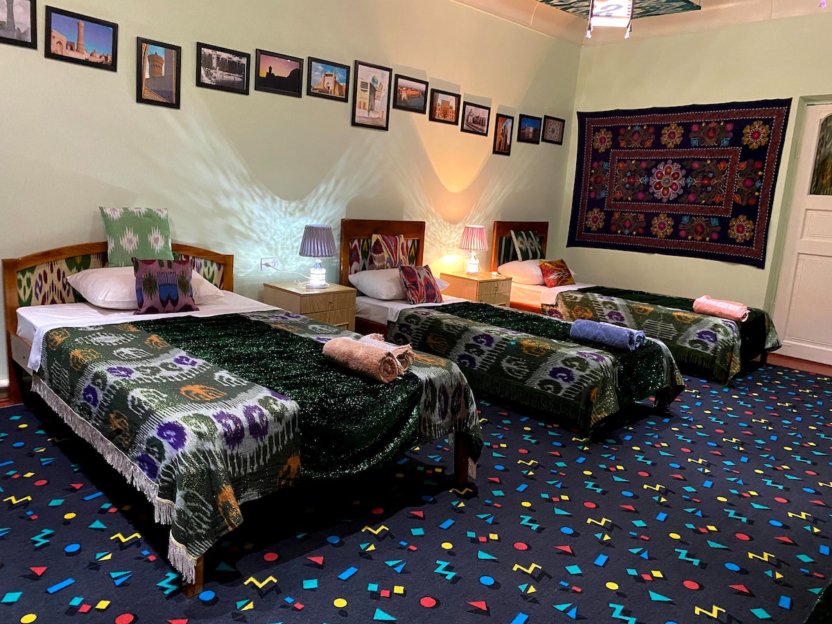 В вашем распоряжении будет старинный дом18 века со всеми удобствами, в самом центре древней части Бухары . Это позволит вам прочувствовать весь колорит и атмосферу города. Так же вы можете заказать мастер класс по приготовлению Бухарского плова .