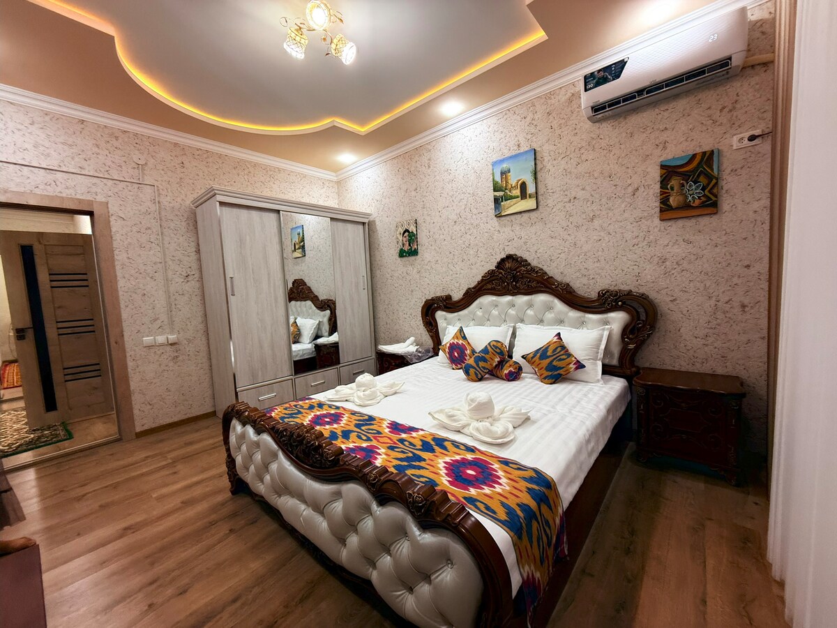 Stay in this spacious and cozy home just minutes from Bukhara’s historic center. With air-conditioned bedrooms, a bright living room, full kitchen, wide hallway, and separate bath and toilet, it’s perfect for families and friends. Free parking, fast Wi-Fi, and easy self check-in/out are available. Accommodates up to 6 guests (5 beds + sofa bed). Only a 10-minute walk to the Old Town, close to the city’s largest mall, cafés, bazaars, and supermarkets.
