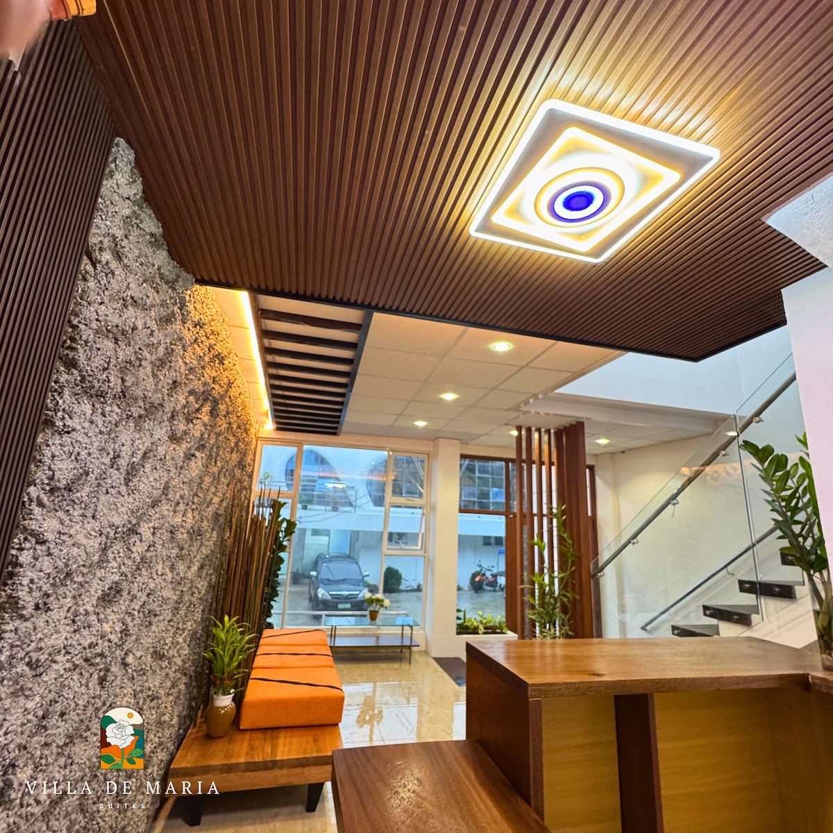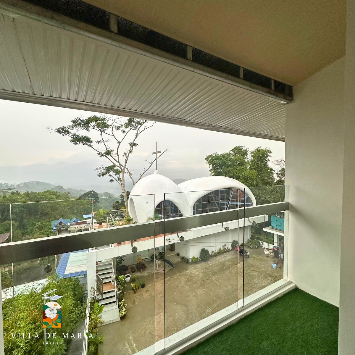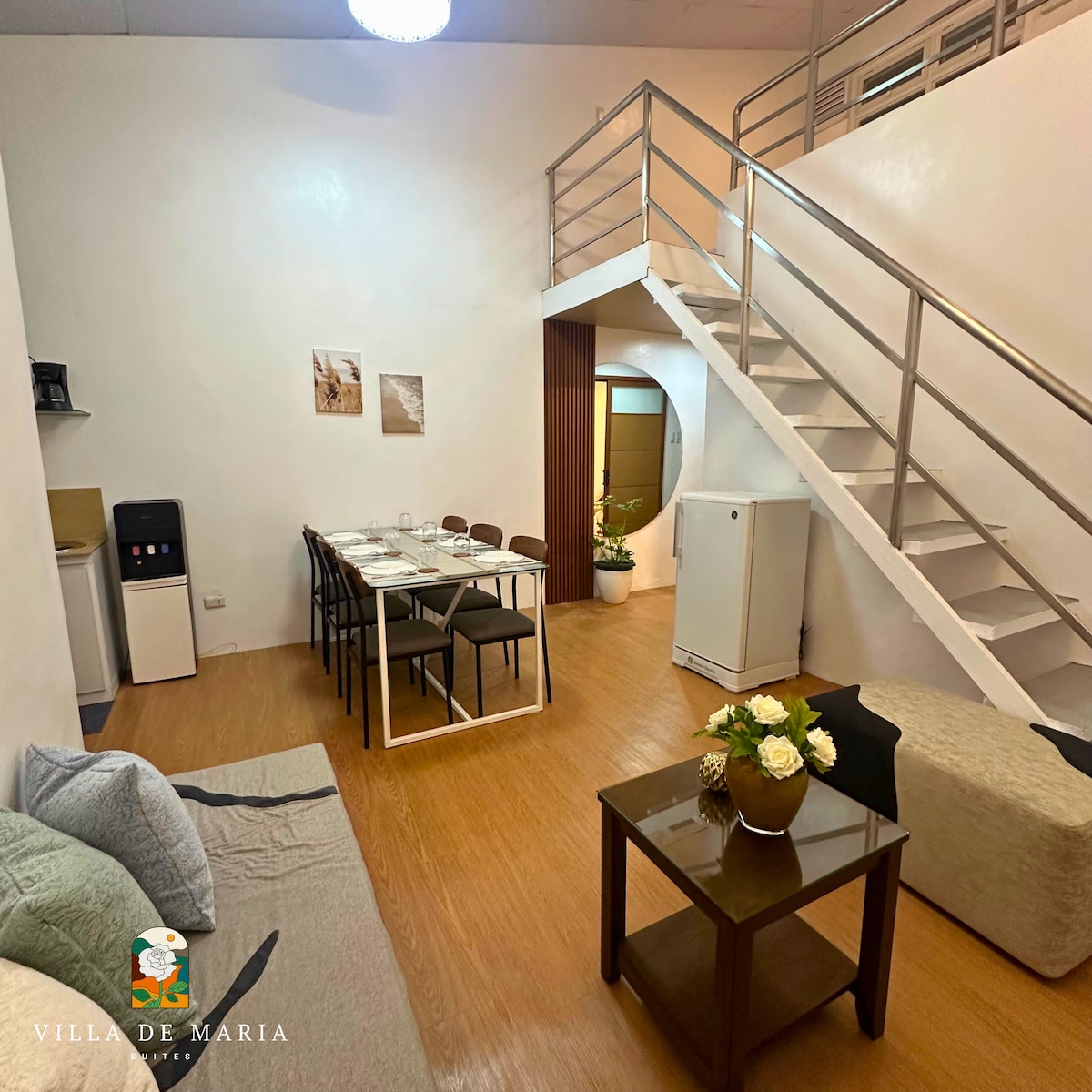 Diamond Suite is a true gem at Villa de Maria Suites — a spacious loft-style retreat perfect for 10–12 guests. It features 5 full-sized beds across 2 bedrooms and a loft, a cozy living area with a 43" Smart TV, a dining space, and a fully equipped kitchen complete with cookware, tableware, and a water dispenser. Enjoy hot & cold showers, hair dryer, fresh towels, and toiletries. Relax at your private corner balcony with a breathtaking 270° view of the sea of clouds, chapel, and Katipunan hills.