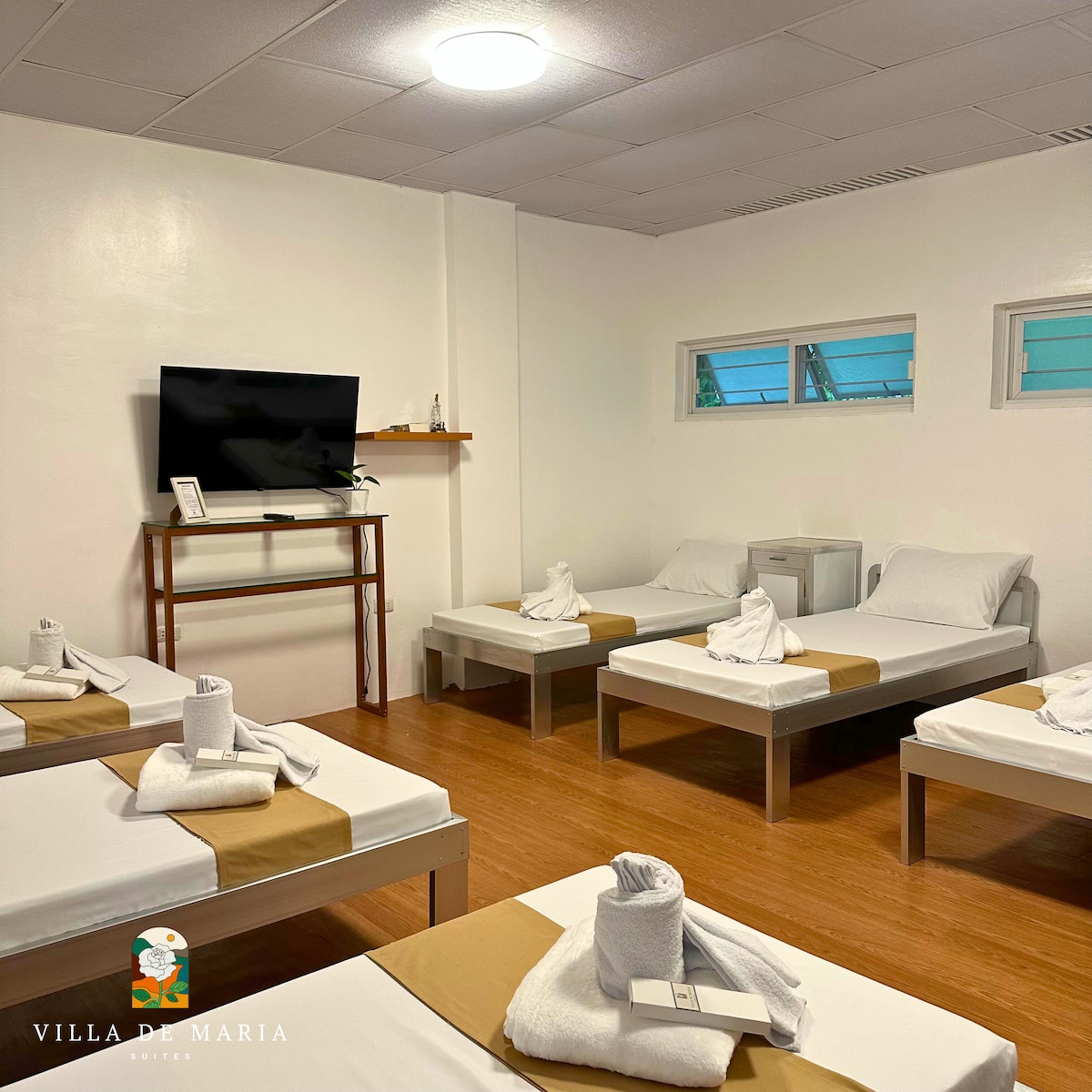 Aquamarine Suite is a charming dorm-style retreat ideal for 4–5 guests seeking comfort and serenity. Enjoy a 43" Smart TV, free Wi-Fi, and hot & cold showers with a hair dryer, fresh towels, and toiletries provided. The naturally cool evening breeze adds to the relaxing mountain atmosphere. Guests also enjoy access to Villa de Maria’s peaceful chapel, gazebo, pond, and gardens—perfect for quiet mornings, reflection, or bonding moments surrounded by nature.