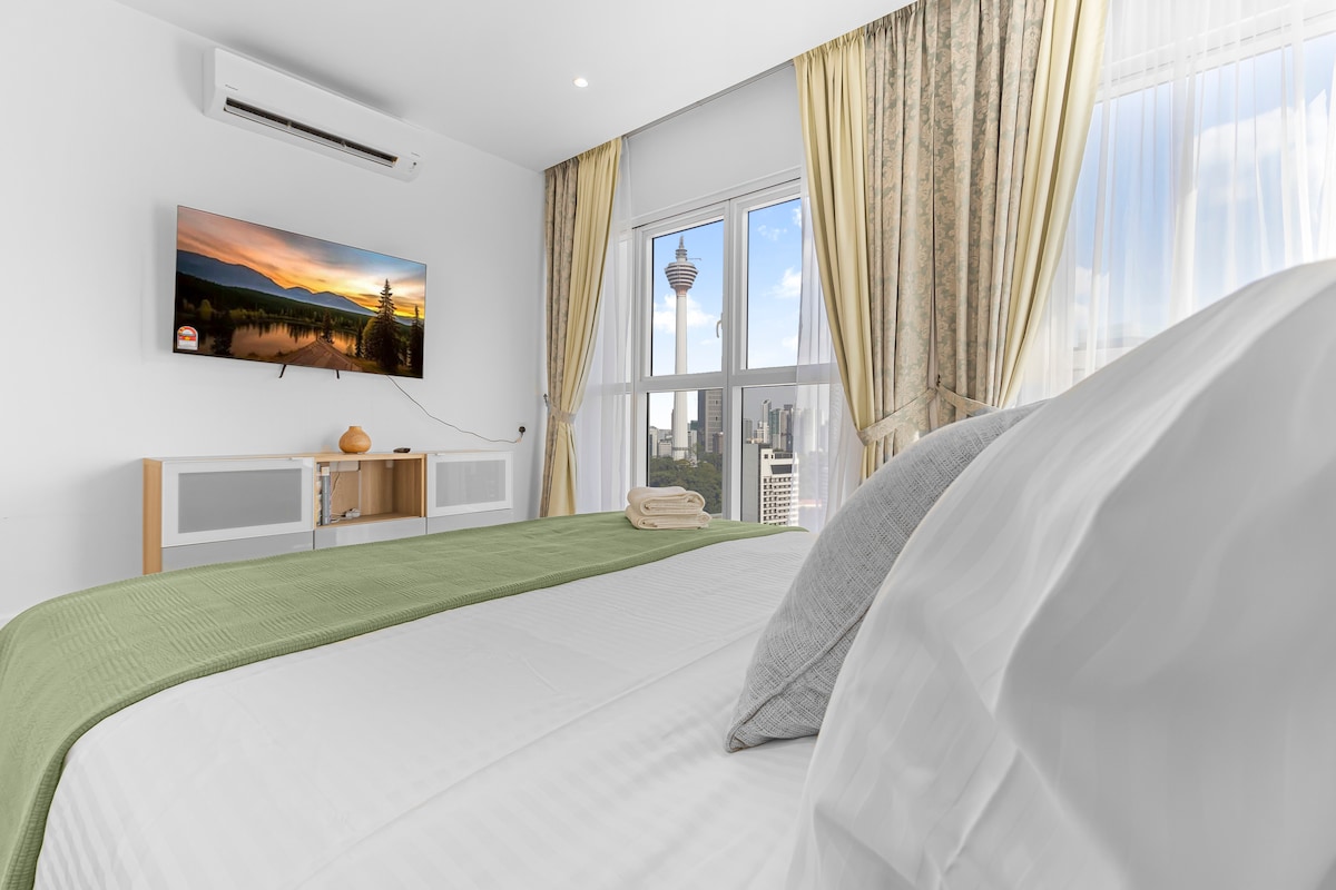 Welcome to our Robertson Residence, a serene sanctuary nestled in the heart of the city over looking the Twin and KL tower landscape. This luxurious apartment promises an unforgettable stay with modern comforts and chic decor. The apartment includes a well-appointed kitchen for those nights you feel like playing chef. The bedroom, dressed in crisp linens, guarantees a peaceful night's sleep.