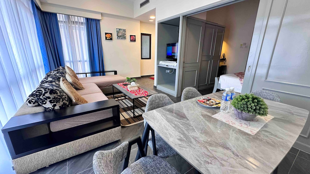 This 1 Br apartment comes with a breathtaking view of KL skyline. It has a 3-seaters sofa living room, dining table, kitchen, desk and a big balcony facing the KL Tower & Petronas Twin Towers. It comes with a 55” TV, Hi-Speed WIFI and a Queen size bed that can fit you comfortably. *The other unit of this Dual Key apartment is a compact Studio with Queen size bed, pantry, washroom & bath. It can fit in friends who travel with you with privacy. Welcome to ask for more details!