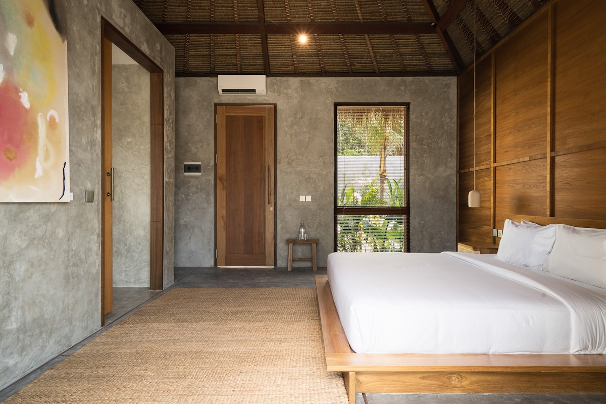 Room 5 welcomes you with warm tones, organic textures, and timeless simplicity. The private pool is framed by tropical greens and a wood deck that invites long, lazy afternoons. Inside, a seamless mix of natural wood and concrete embodies a grounded sense of luxury, while subtle wabi-sabi accents give soul to the space. Ideal for couples or solo travelers seeking inspiration, beauty, and tranquility in Uluwatu.