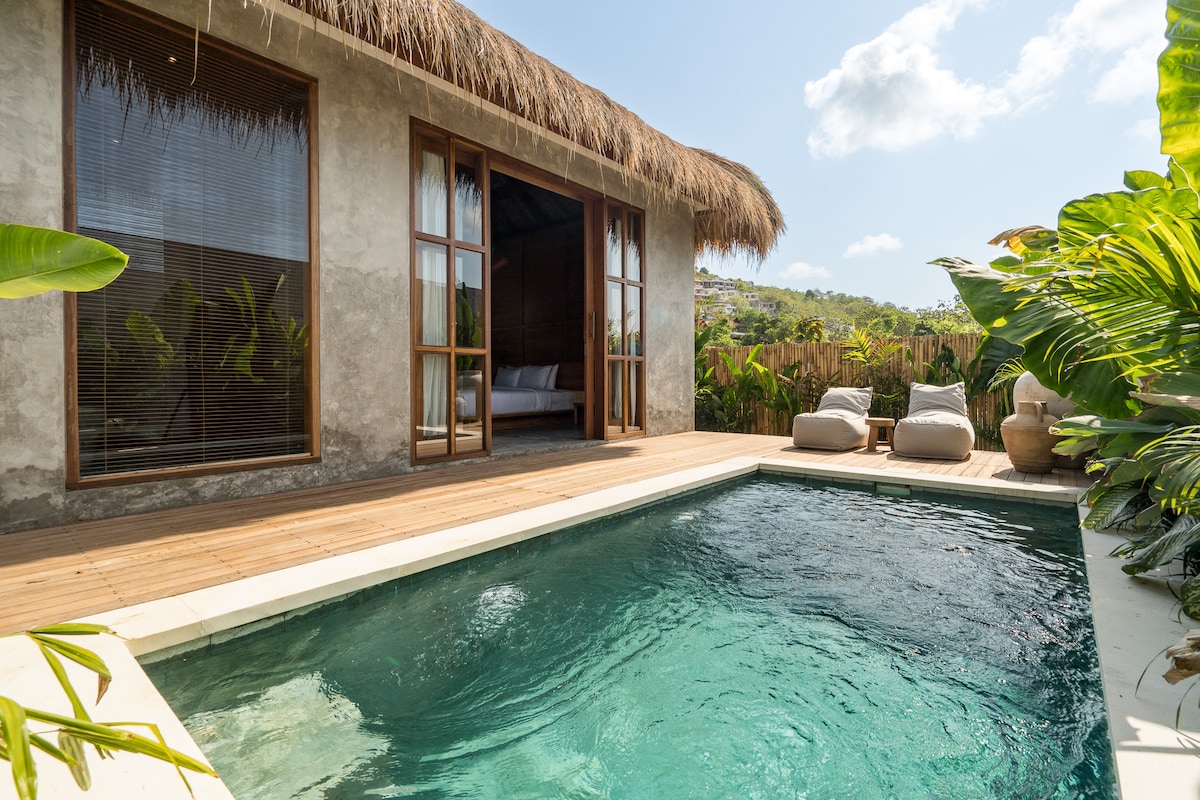 Room 3 is a beautifully balanced retreat combining earthy textures, minimalist design, and tropical warmth. Enjoy your private pool surrounded by a large garden wrapped in vibrant tropical greens, with a wooden deck made for reading, journaling, or simply being. The wabi-sabi details, natural wood elements, and gentle concrete tones make this room a cocoon of grounded luxury. Every corner reflects calm simplicity and intentional design, ideal for guests who value authenticity and peace.