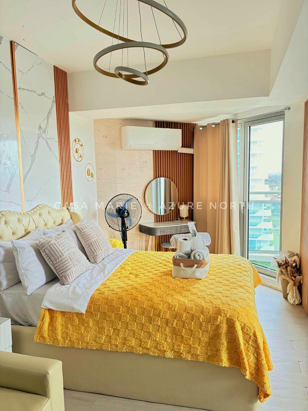 Located @ Azure North San Fernando Pampanga. Guest Fee for more than 4 pax, ONLY infant or 3yrs old below is 300php. We need ID of all guest for gatepass Inclusions: *Air-conditioned Unit with Balcony+View of Mt. Arayat & Sky Ranch. *Double Bed+Pull Out Bed *Wifi+Netflix+Video Games *Free Outside Parking *Microwave, Ref, Kettle+Rice Cooker *Cookware + Utensils *Hot+Cold Shower *Towels, Hair Dryer *Portable Iron