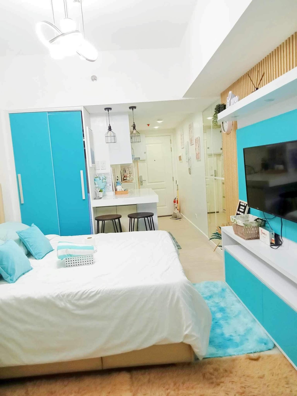 Our Bali-inspired studio offers breathtaking views of the man-made beach from the private balcony. Relax with a cup of coffee and enjoy the view! This studio comes with queen size bed for Netflix & chill, fully-equipped kitchen for home-cooked meals and lots of entertainment like PS4, karaoke and boardgames. Nearby attractions: • 5mins drive to SM Pampanga, Robinsons and S&R • Close to cafes & restaurants • 35mins away from Clark International Airport
