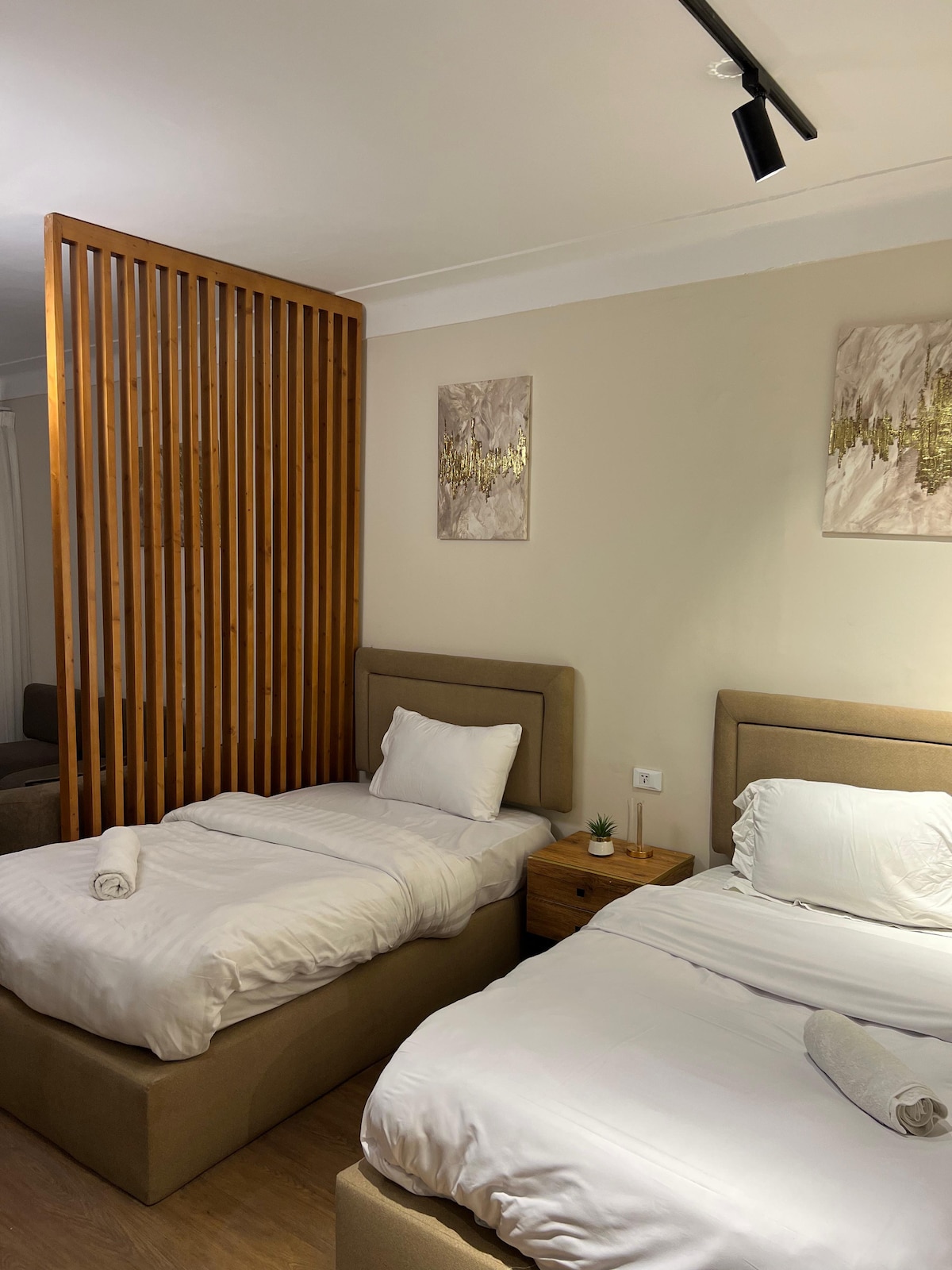 Nestled in the heart of Downtown Cairo, this stylish retreat blends rustic charm with modern comfort. Featuring natural wood accents, woven textures, and warm lighting, it offers a cozy yet elegant atmosphere. Enjoy stunning minaret views and a peaceful escape just steps from the Egyptian museum,the famous koshary Abu Tarek, and the metro station and other cairo’s landmarks. Perfect for travelers seeking an authentic yet serene stay in the heart of Cairo.