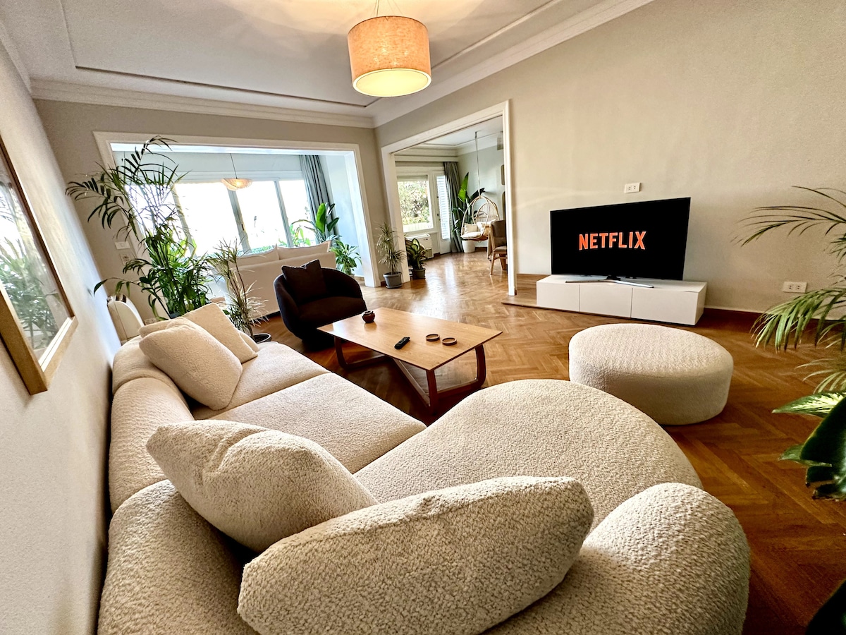 Welcome to our Nileview loft, Your charming home in the heart of Zamalek, Cairo's most central, safe, and vibrant hub. The stylish living room boasts a 55-inch curved smart TV and panoramic views on the Nile. A boho dining room with a bamboo swing overlooks a gorgeous Nile view. Two cozy Master bedrooms featuring noise canceling windows, memory foam mattresses, Egyptian cotton beddings, and a private bathroom in each room. Relax in comfort and style with a touch of bohemian charm by the Nile.