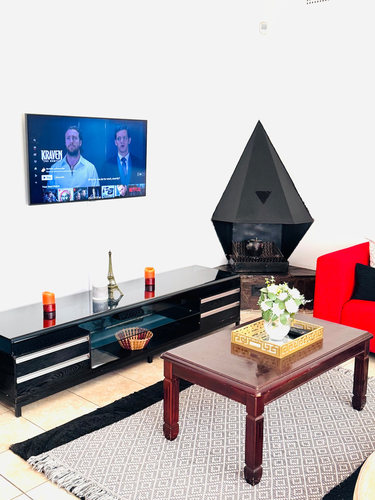 Three bedroomed house (MES) in a quiet neighborhood with a mid sized pool. Offers high speed uncapped wifi and two bedrooms are equipped with smart TVs with Netflix access. Comfortable work space for business travelers. Fully equipped kitchen, solar and generator back up- trampoline for kids, very ideal for families. Very secure with rapid response. Property manager available 24/7. Complimentary airport pick ups and special car hire rates for guests.