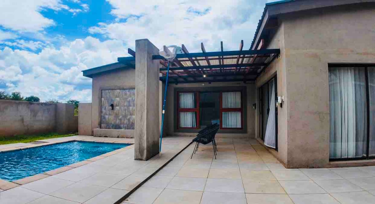 Kick back and relax in this calm, stylish space. WiFi and solar in place. Multiple wall mounted braai stands with one stand in the veranda next to the house entrance. Early check in will be accommodated where possible. Newly built space being polished up but can be booked for now at a discounted price. Pending items: - no wardrobes yet - contractors are attending to some snags and the intention is to have this beautifully designed home finished off nicely soon but can be used now.