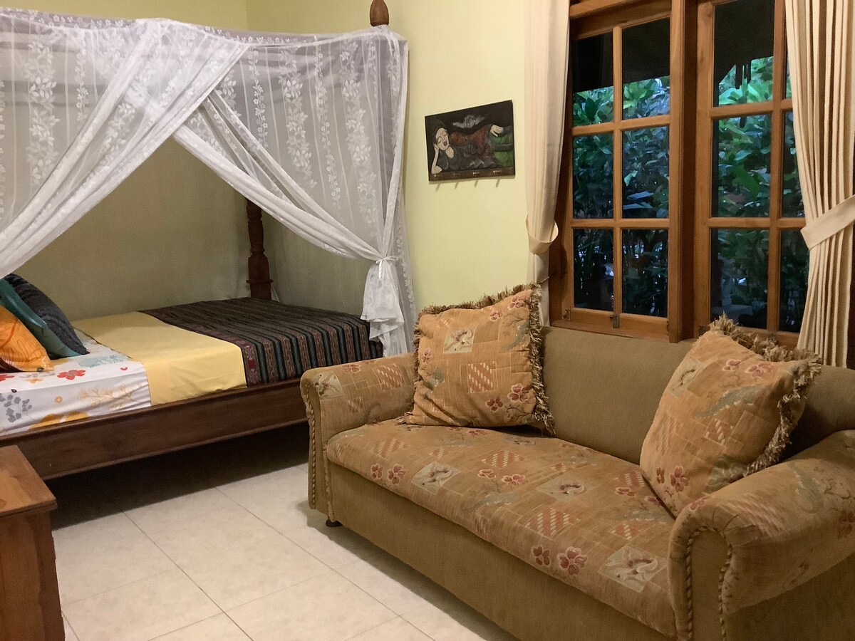 Experience tranquility in this charming 1-bedroom bamboo and wood cottage, nestled in nature. The cottage features high ceilings and a queen-sized canopy bed with a comfortable mattress and pillows, ensuring a restful night’s sleep. This peaceful retreat offers a serene atmosphere, ideal for those seeking comfort and relaxation in the heart of nature. It is an ideal option for a solo trip or a couple's romantic getaway in the heart of Bali! Book your stay with us today!