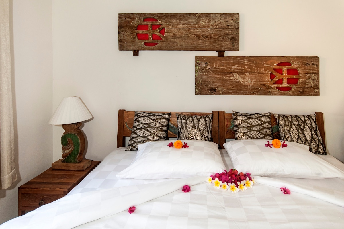 Immerse yourself in traditional design and comfort, complete with fresh linens and towels, A/C, and comfortable beds for a perfect night's sleep. Each room includes a cabinet and towel rack, as well as a private outdoor seating area for relaxation. Take a quick two-minute walk to the beach, where you can catch sight of playful dolphins, or dine at the delicious nearby restaurants and Warungs. Don't miss out on nearby attractions like breathtaking waterfalls and stunning temples.