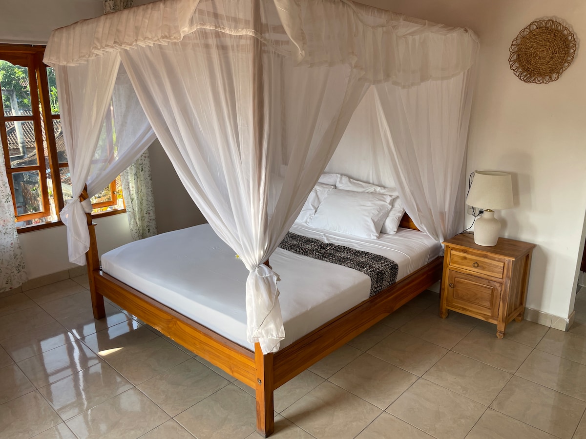 Immerse yourself in traditional design and comfort, complete with fresh linens and towels, A/C, and comfortable beds for a perfect night's sleep. Each room includes a cabinet and towel rack, as well as a private outdoor seating area for relaxation. Take a quick two-minute walk to the beach, where you can catch sight of playful dolphins, or dine at the delicious nearby restaurants and Warungs. Don't miss out on nearby attractions like breathtaking waterfalls and stunning temples.