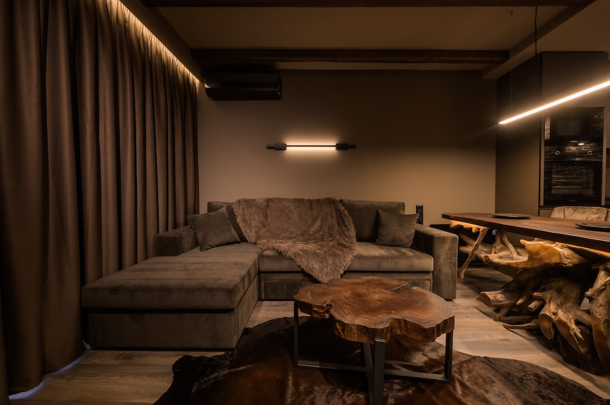 Welcome to our brand new luxury apartment in Bansko, nestled amidst the breathtaking Pirin mountain range. Immerse yourself in a unique cave-inspired retreat adorned with rustic stones and warm wood accents. The double bed promises ultimate comfort, while hidden LED lights create a magical ambiance. Experience a seamless blend of nature and opulence, with panoramic views of Bansko's ski resort. Your mountain escape awaits, where every detail whispers tranquility and elegance